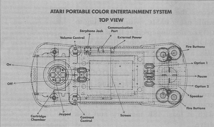 The Portable Color Entertainment System was developed in conjunction with Epyx. It is controlled by an 8-way joypad, plus two fire buttons and five function buttons. The screen image can be turned upside down to make the controls more comfortable to left-handed players.