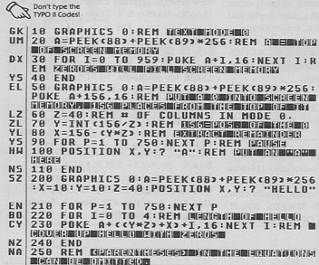 To RUN the second part of the program, type GOTO 50. This POKES a 0 into screen memory, converts the location into XY coordinates, and then prints an A there. The third section of the program is run by typing GOTO 200. This will print HELLO at the designated XY coordinates and then overwrite the word by POKEing 0s into the appropriate screen memory locations.