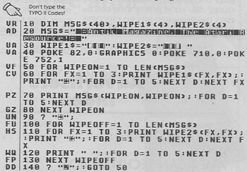 This short program by Mark Perez, of Fremont, California produces an impressive "line wipe" effect for erasing text from the screen. Its secret lies in the clever use of the ATASCII character set in Wipe1$ and Wipe2$. Use this routine to dress up your own programs