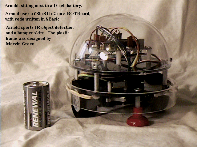 Arnold (221K): A six-inch tall robo-pet driven by modified R/C servo motors, with a BOTBoard for a brain. Arnold sports IR object detection and a skirt of bumper switches. It uses furniture drawer knobs fore and aft as casters. The frame is a plastic, two-tiered base sold by Marvin Green. Marvin also sells the BOTBoard; great product.