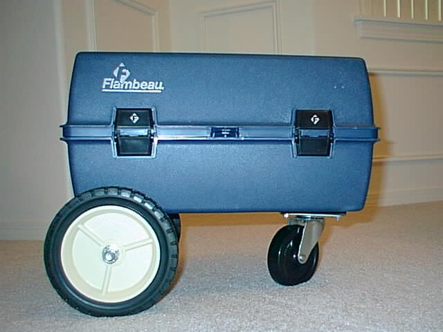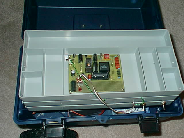 Tacklebot #1 (42K):  I built Tacklebot by bolting a large tackle box onto a pair of gearhead motors and a swivel caster.  TB has plenty of carrying capacity, owing to the large motors and batteries.
