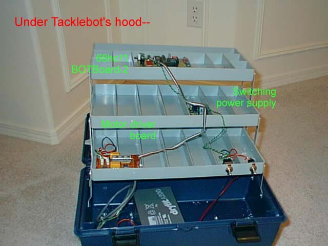 Tacklebot #2 (42K):  A look under the hood.  Tacklebot has a 68hc11 BOTBoard 2 onboard, with firmware written in SBasic.  The current firmware lets me drive TB around using a tethered cable to a portable RS-232 terminal.