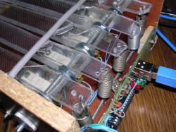 | The construction is a bit different than Engelbart's, which can be seen in the Official Engelbart's NLS page: The key in original solution is pushing the button from below, the button is located above. This way the force to push a button is very small, but the key has to be very light not to push the button acting with force momentum. Engelbart used a thin pieces of flat metal, probably cut and rolled twice in one end to rotate on a shaft. There are two problems: One, if too bif gorce is uset, the metal may bent. Second, the springback is not very good. Because I had problems with cutting metal precisely (and not slashing hands during usage on sharp edges), I decided to use epoxy glass for keys and press the buttons located below the keys. Keys are quite thick (8mm) with 4mm holes for shaft. The epoxy glass is from old LCD. This glass also has quite nice engravings which prevent fingers from slipping on polished surface. |