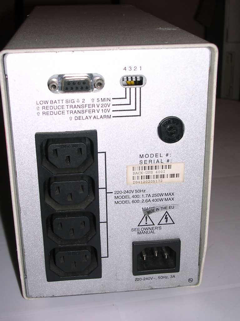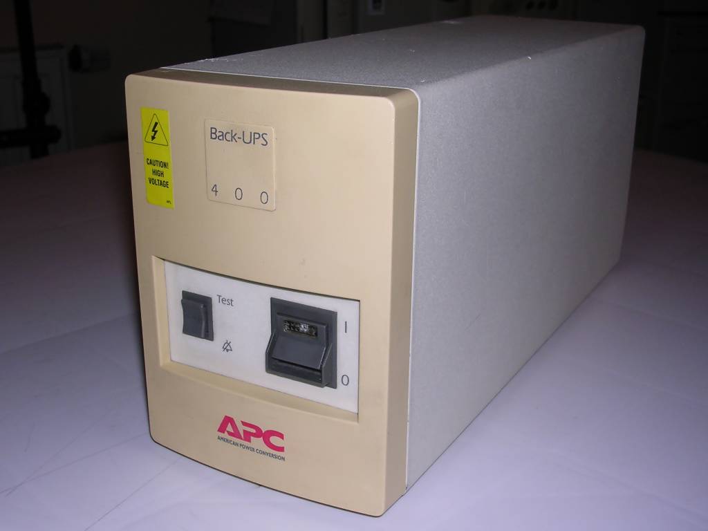 This is an UPS from mid-1990s, it contains one 14V lead-acid battery, being sufficient for a few minutes of PC operation with a small CRT monitor. Although it has serial port to communicate with software, I have never managed APC programs to communicate with it - it probably needs an early version of APC PowerChute program from early 1990s.