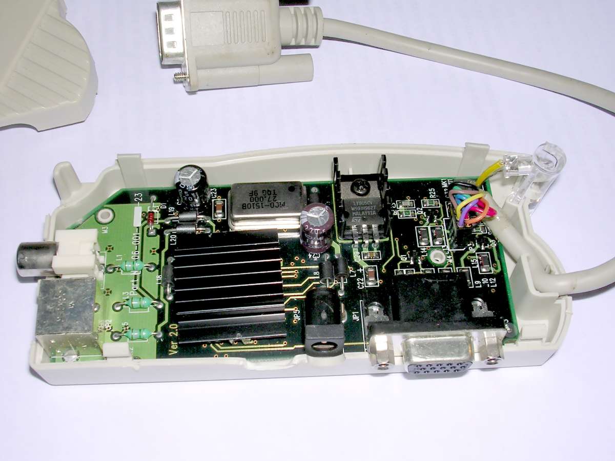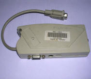Finally, numerous VGA converters have been made. This is a typical model from ca. 1995 which can convert 640x480 to TV-compatible composite video signal. A proprietary chip is used for it. It requires supply voltage around 9V, with ground to the inside of the connector.