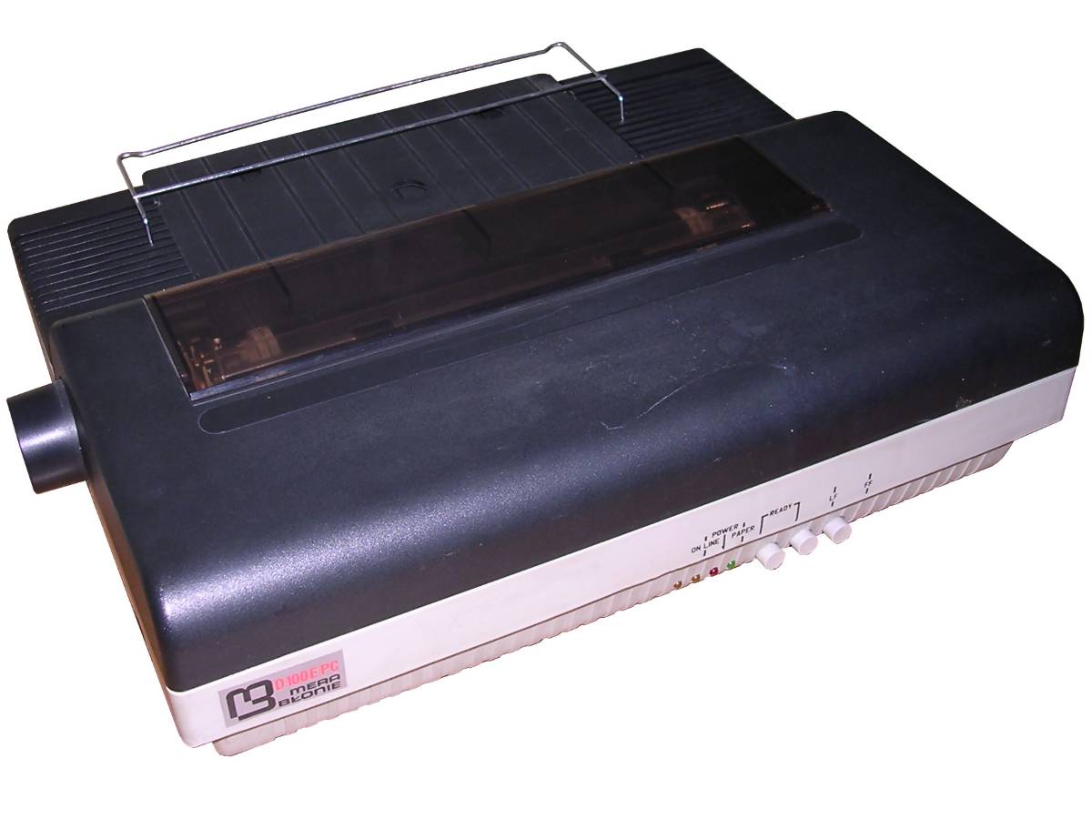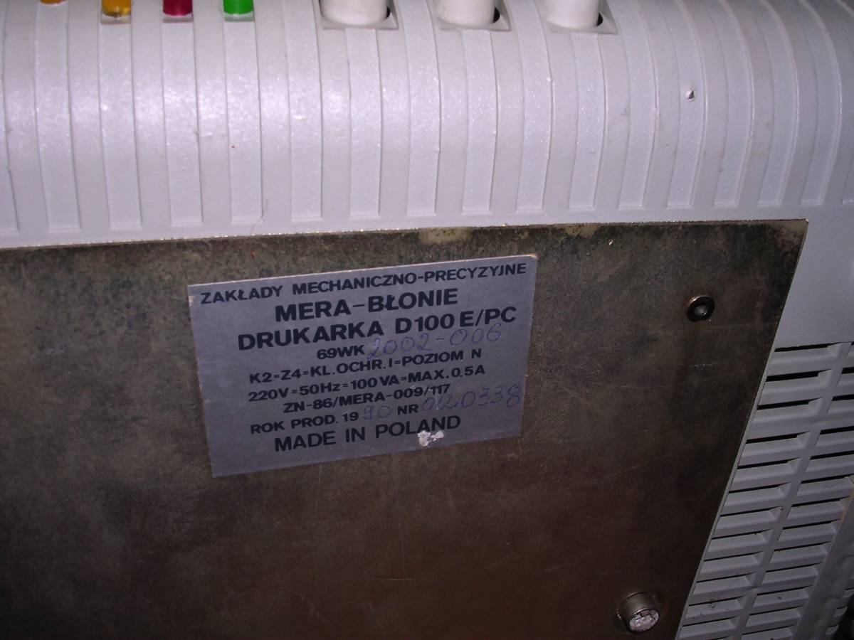 A 9-pin serial and parallel port printer made in Poland in 1990, but manufactured since late 1980s. The D-100E/PC was a re-designed D-100 printer, used in microcomputers. The mainboard has been totally re-made making it possible to print using parallel port. This printer was used with Mazovia and Elwro 801AT Polish personal computers and it was usually printing on continuous paper - although it was possible to put separate sheets, it had to be done totally by hand - like into a typewriter.