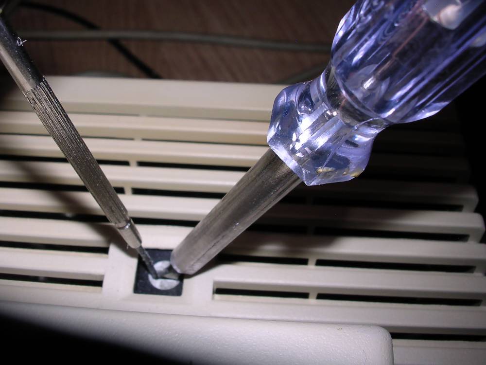 Then, use screwdriver to unlock front panel by putting it in two holes on the upper side of the computer. Pull the front panel towards you, it should open leaving CRT and keyboard.