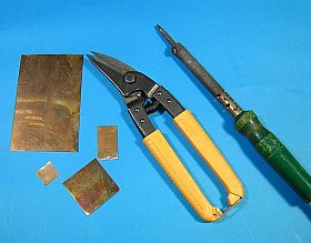 最初は、コの字型と一の字型の板同士を組合わせるつもりだったのですが、曲げがやり易いLの字型用の2枚を切り出して曲げ、半田で貼り合せました。 (余談ですが、この燐青銅板、半田付けは大変やり安いですね。でも、バネ効果が強いのがチョット困るのです。柔らかい銅板だったら曲げも楽だったんですが)