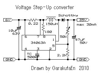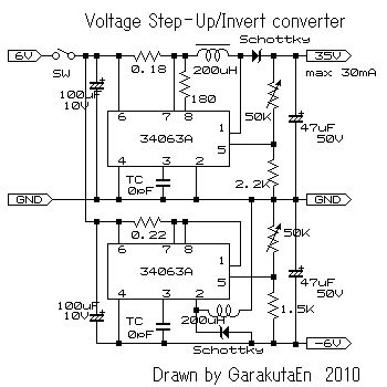 使われていたICは、34063Aと云う石で、接続を少し変えるだけで、昇圧、降圧、逆圧のどれにでも出来るそうです。但し、部品の定数はそれぞれに最適値があるようですが。(資料DLサイト)