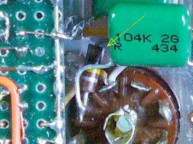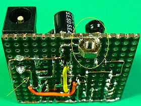 ちょうど出力トランスの下側に空きスペースがあるので、そこに取り付けてみました。(左写真<クリック>。裏配線面は、白ガム・テープで被覆)