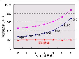 左図の中央がアンテナ側同調周波数、上部が局発周波数、下部が両者の差で、全域で455KHzになっています。大変結構!