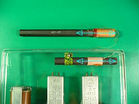 始め、バーアンテナは、多少感度が良かろうと長い方(約14cm長)を考えていましたが、インダクタンスが大き過ぎて低い周波数範囲でしか同調出来ないので、短い方(8cm長,およそ450μH)に替えました。(左写真&<クリック>)