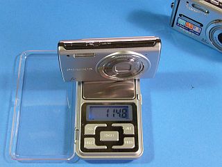 ターゲットのFE-5050と、このFE-330と重さの比較をしてみました。(いずれも5倍ズーム、バッテリは全部同じ、メディアも装着済み)