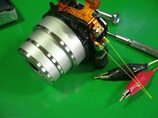外部電源(約4Vほど)を使って、駆動モータの端子に+、−(または−、+)をちょいちょいと印加してみました。(長くやると、壊れる恐れあり)