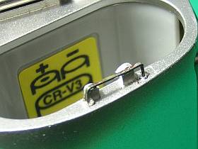 このCP3100も、例によって電池蓋の留め部が破損していたので、今回は手軽にホッチキス針を利用して補修。