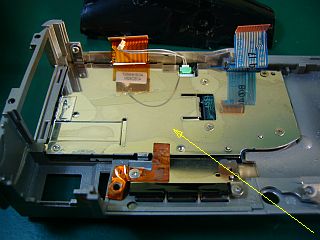 「本体死亡機」は、電源SW線を含む「青色フレキ(シブル・フラット・ケーブル)」の何処かが断線していたはずで、「液晶+裏板」はそのままでは使えないわけだ。(図7)