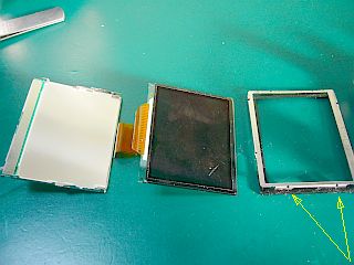 それらが分離したので嵌めようとしている内に、“小さな出っ張り”の付いた「黒いプラ枠」が千切れたりして、「外枠」がパチン♪と素直に嵌らなくなり、「液晶部」がなかなか一体化出来ずに、焦った!