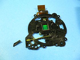 飛び出したレンズ部を戻すには、やはり最終的には実力・力技が必要なようなので、一応CCD搭載部は外しておきました。(左写真<クリック>)