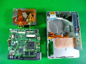 裏カバーを外すと見えますが、液晶部の接続コネクタは2箇所あり、これらで主&副基板と接続。どちらも接続部も、外すのは簡単でした。(左写真<クリック>)