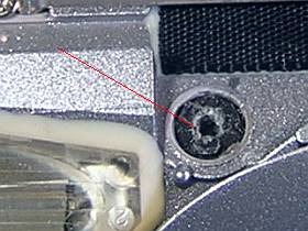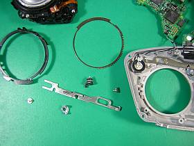 レンズ胴周りにあるリング状のギアと摺動板を駆動するヘソとの位置関係に、不具合があるのでは?と、これを調べてみました。(左写真<クリック>で、リング状ギア)