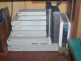1台目のモデム:遂に、渋々、PPPoA方式のモデムを探し回り、オークションでFlashwave 2040 M1(PPPoE/PPPoA両機能有り?)を見付けて、買いました。(左写真中央。総費用\850)