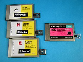 写真左上から、USRobotics製28.8K(XJ4288)、33.6K(XJ1336)、56K(XJ1560J)、右側は3Com製56Kbps(3CXM756)。