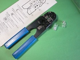 最近は、LANケーブルも安くなって来たので、以前買った10Base-T用圧着工具(\1,970+税)はもうお役ご免かな?と思っていましたが、なんのなんの!こんな風に、クロス・ケーブル(特に適当な長さのやつ)などを自前で作れて便利が良いので、まだまだ使えそうです。