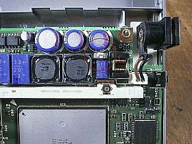 取り出したマザーボードを裏返すと、電源ジャック(正しくは、レセプタクル?)の近くにあるフューズ(3.15A)が、直ぐに見付かりました。テスタで当たると、"断"!