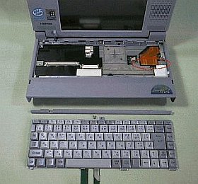外す時に問題なるのは、液晶ユニットへ行くフレキ(シブル・ケーブル)で、これがずっと手前(内側)にあることでしょう。だから、解体は、先にキーボードを外し、液晶ユニットへのフレキを外してから、本体の上下殻割りをした方が楽なようです。