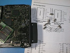 元の発振子は、14.3MHz。これへの配線を途中でカットして、買って来た発振子(16.9MHz等)を上にくっ付けてみた。確かに発振はしているし所定周波数になっているのだが、CPUクロックの方は相変わらず40MHzのまま。(PLLシンセサイザが、よく分かっていないせいもあるが、まあ、何の工夫も無い無駄な?試みではあった)