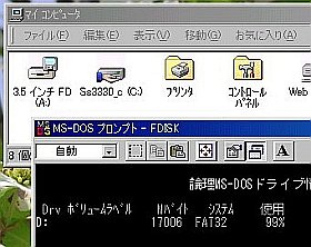 そこで、DOSモードで再起動してFDISKでみたら、Dドライブはちゃんと存在している!...なのに、Win98上では見付けられない。
