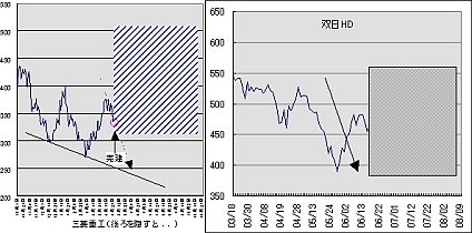左の2図はある2銘柄の値動き(別時期)で、仕掛けた時点以降を目隠ししてみたのだが、これらは実に教訓的(?)。どちらも下がるはずだと思い込んで/思い込まされて「信用売り」をした。(しかも、2度まで!)