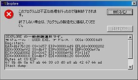 近頃、ブラウザIE6.0が、何故かよく(と云うより、必ず)落ちるようになった。(リンク先をアクセス後、そのウィンドウを消した後で「お気に入り」を開こうとすると、落ちる。IEXPLOREの「一般保護違反」だそうだ)