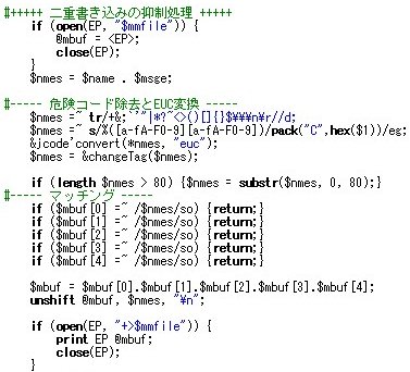 今回のエラーは、(過去の書き込みと今書き込もうとしているものとの照合)マッチング処理でのトラブルで、SJIS使用のせいで「照合文字列」の中にPerlの常用記号が入るために起きた。