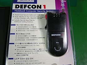 yaKoさんの「一言板」でのヒントで思い立って、ノートPC持去り防止用に、セキュリティ・グッズを買って来た。Targus製DEFCON1なるノートPC固定用の錠とワイア。(\500税込)