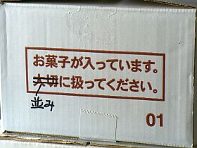 左写真は、家人が通販で買った創作菓子?の送箱。