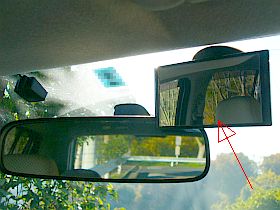 出来れば、もう少し曲率の大きい小型横長ミラーとして、標準バック・ミラーの上部に着けたい。(言わば、遠近両用眼鏡のミラー版ってところ。“一体化もの”なら、特許に出来るかな?特許広報例)