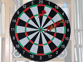 安全性の点からは、ソフト・ダーツの方が良いかと思ったが、やはりゴツン!と刺さる音がしないと、面白みが少なそうなので、ハード・タイプにした。(しかし、早々に、手元が狂って、傍の金物に当たって、一本黄色矢の先が折れてしまった。左写真<プッシュ>)