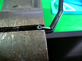 車輪が外れていたのは、車軸が折れて無くなっていたせいで、これを修理するには、孔を開けて“別の軸”を差し込む方法しか無さそう。