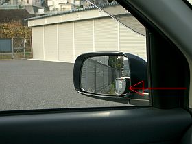 ドアミラー本体は、左側後部やや外寄りの向きにセット。小ミラーは、更にそれより外向きにセットして、補いにしている。