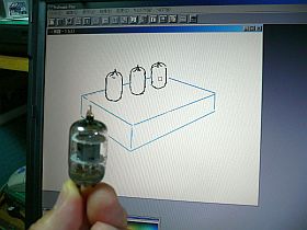 “6AK5ラジオ”の構造案を、いきなり物を作る前に、“絵”に出来ないかと(無謀にも)考えた。(多少、遠近法の心得もあるので、然程無茶な絵にもなるまい。左写真。(^^;?)