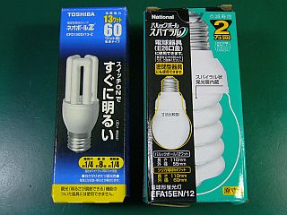 門灯の蛍光灯が点滅(不良化)し始めたので、日本橋の電飾店で買ったのだが、偶々店内の「特価品\400〜」と書かれた“見切り品箱”の中に、アーム・スタンド用として使えそうな13W蛍光球(60W相当品)を見付けた。