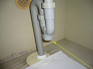 「臭気留めU字管」の下に付けてある「蓋」にひび割れが生じていて、ここから水漏れがあった。(図1)