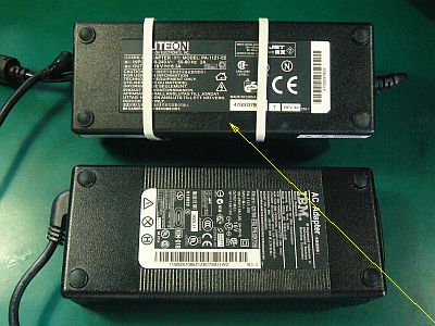 で、19V,6.3Aのものを、「電源端子(特殊?)」を確かめて、ヤフオク!で買った。(図1上側 ¥1,050送料込み)