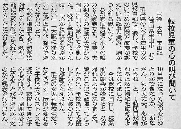 やはり、今まで何度も取り上げて来ている「いじめ」も、親でないと、子供は救えないという思いが、益々強くなりました。