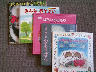 BOOK-OFFで探して来た数冊(\105〜\650)の内、興味を持ってくれたものを分析して、更に追加で選んで買って来たものの半分が、左上写真の絵本群です。ただし、これらは、まだ、当人が興味を持ってくれていないグループのものです。私の期待だけは強いのですが。(苦笑)