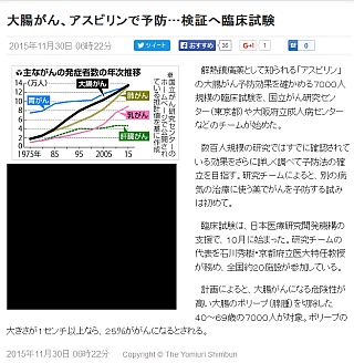 「大腸がん、アスピリンで予防…検証へ臨床試験」