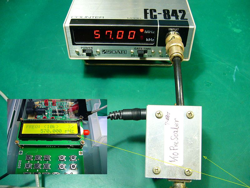 以前に注文していたプリ・スケーラIC「MC12080」(2個¥1,500送料込み)が来たので、汎用カウンタ「FC-842」(max 50MHz)用として、「1/10プリ・スケーラ」を作成した。(図1