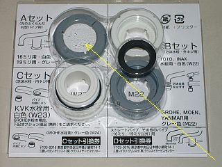 一番気になっていた「取り付け」は、色々な蛇口に対応出来るよう、数種のアダプタが添付されていました。(左写真)
