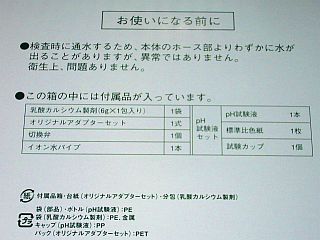 必要付属品以外に、PH試験液セットが付いていたのに、一瞬“機器の性能”に不安を感じました。無いと駄目な装置なのか?それに、一々自分で確かめるのも面倒だし。
